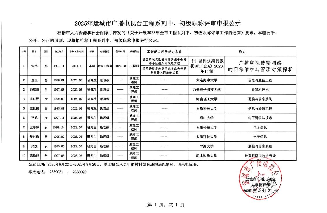 2025年运城市广播电视台工程系列中、初级职称评审申报公示